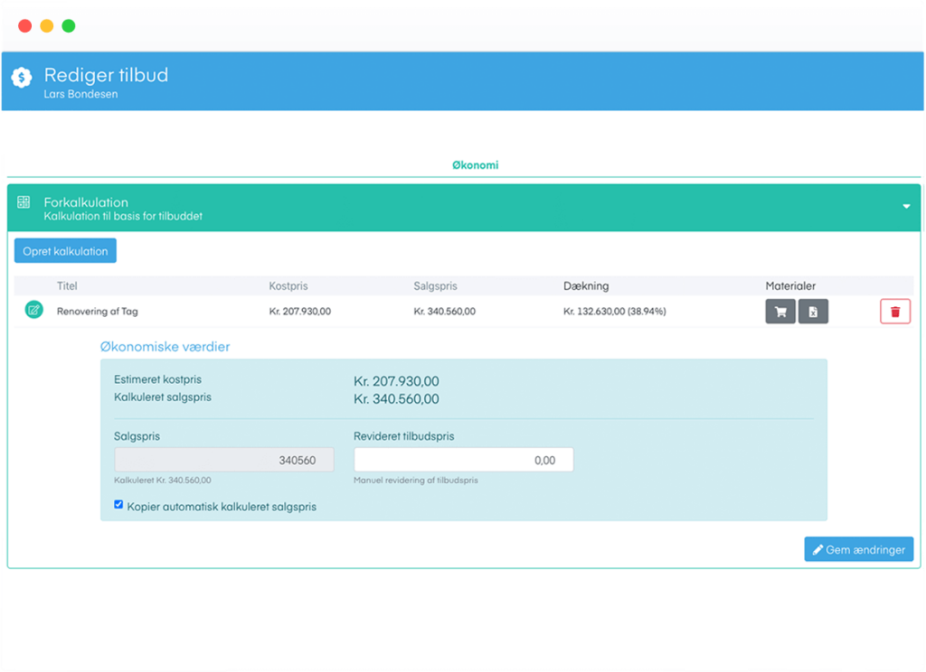 Når der trykkes på ”gem kalkulation” vises en estimeret kostpris og en kalkuleret salgspris og et tilbud kan sendes til kunden. Har du senere behov for at rette i tilbuddet, går du blot ind og retter i tallene og sender et opdateret tilbud afsted.