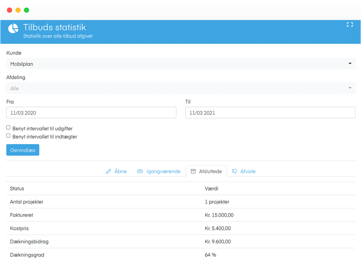 Når projektet er afsluttet, kan du derfor med det samme se projektets dækningsbidrag og dermed finde ud af, om økonomien i projektet levede op til dine forventninger.