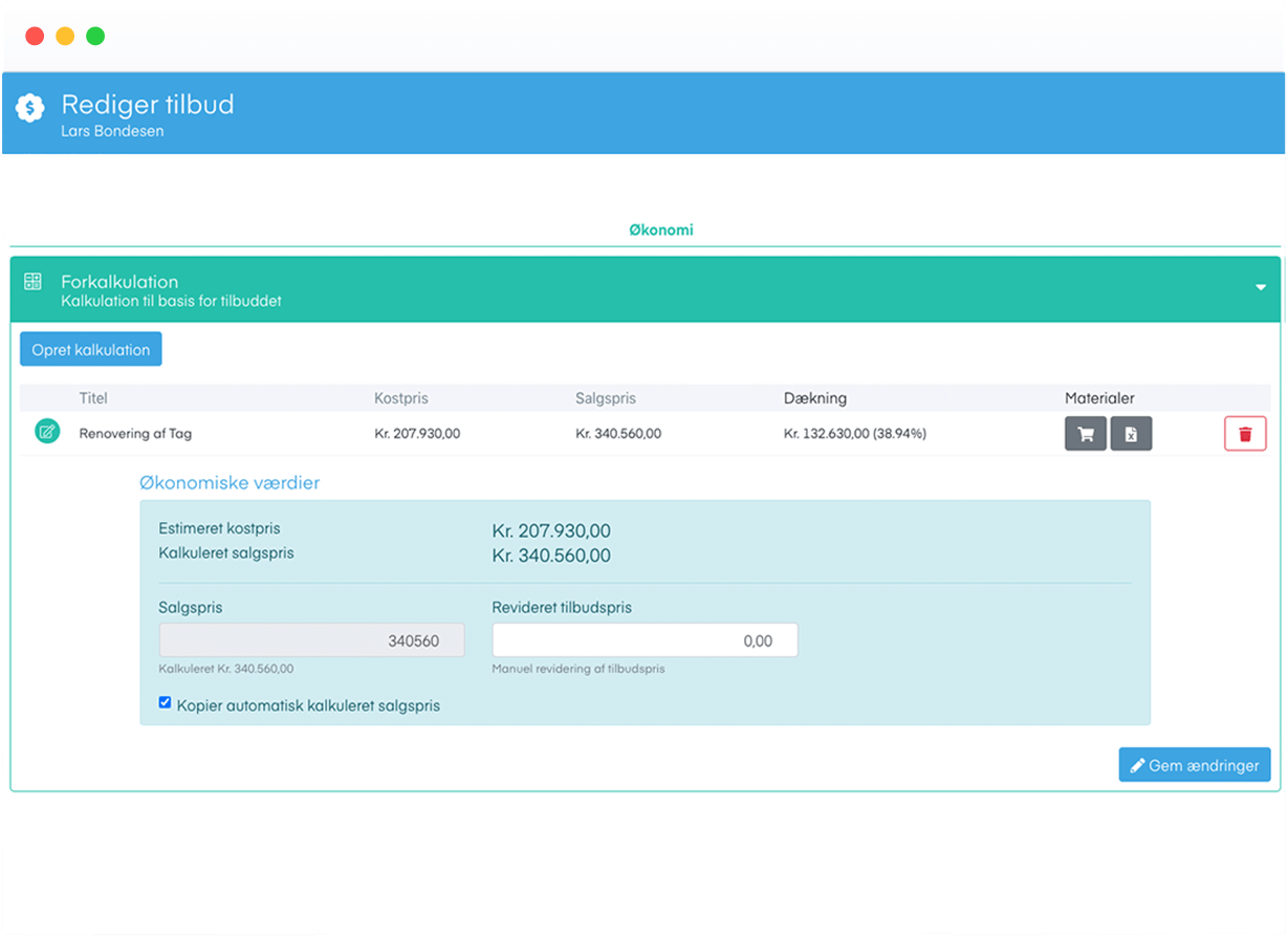 Når der trykkes på ”gem kalkulation” vises en estimeret kostpris og en kalkuleret salgspris og et tilbud kan sendes til kunden. Har du senere behov for at rette i tilbuddet, går du blot ind og retter i tallene og sender et opdateret tilbud afsted.